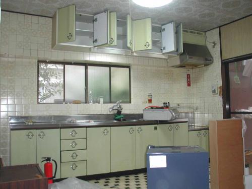 キッチン全景 前回改装より20年経ち、キッチンが古くなり、床もがたついてきたので改装工事行いました。